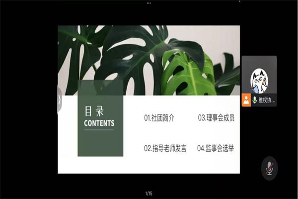 会议流程分为社团简介、社团理事会成员介绍、指导老师发言、社团监事会选举四部分。维权协会理事会对此次活动进行了合理的规划安排,以保障此次活动的顺利开展。