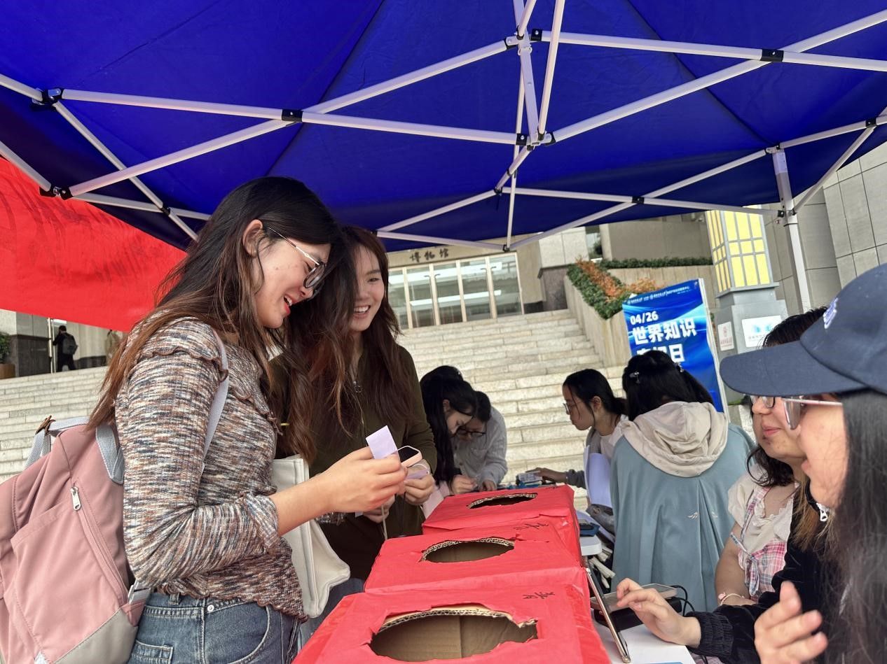 本次知识产权宣传活动以知识有奖竞答为核心,同步推出知识产权文创作品征集大赛、模拟法庭情景剧展演及知识产权主题电影放映等创新环节,创下近三年参与规模新高。三场有奖答题活动分别在图书馆正门、木兰路和桃子湖创意产业园同步开展,现场精心布置知识产权宣传海报与标语,通过图文展板解析知识产权法律体系,吸引众多师生驻足参与。活动特别设置互动答题区,题目涵盖著作权、商标权、专利权等基础法律知识,参与者通过趣味抽签方式轻松学习知识产权相关内容,在寓教于乐的氛围中提升知识产权意识。